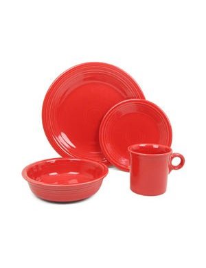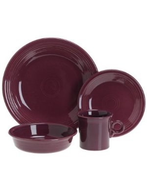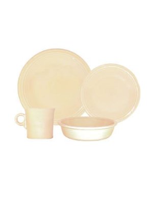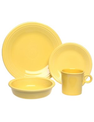 The perfect set to kick off a Fiestaware collection, equip a college dorm room, or pair with other Fiestaware pieces for a larger set, this four-piece place setting from Fiestaware consists of a dinner plate, salad plate, bowl, and mug. Celebrated in the 1940s, ’50s, and ’60s for its streamlined art deco look and colorful glazes, Fiestaware is enjoying a remarkable comeback today. All pieces in this set have the signature Fiestaware rings and match Fiestaware pieces in sunflower yellow or deeper colors such as black or plum. With over 50 Fiestaware dinnerware and accessory pieces to choose from, you can build your collection over time starting with this one-person set. The 100 percent lead-free glaze is nonporous, so it won’t absorb foods, and it’s durable enough to withstand the microwave and dishwasher.