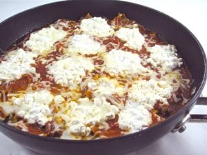 Here’s a photo that might help. It’s the lasagna in the skillet with cottage cheese dolloped on top and sprinkled with a little mozzarella cheese.